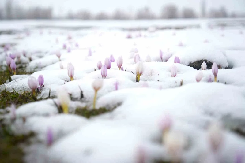 Muş Ovası’nda havaların ısınmasıyla açan çiğdemler, ani bastıran kar yağışının ardından beyaz örtüyle kaplanırken, ortaya güzel manzaralar çıktı.
