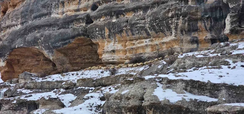 Malatya’da etkili olan yoğun kar yağışı kırsal bölgelerde hayatı olumsuz etkilemeye devam ediyor. Akçadağ ilçesine bağlı Küçükkürne Mahallesi’nde yetiştiricilik yapan bazı üreticiler, hayvanlarını yemlemek için bin 600 rakımdaki kayalık alanlara çıkarmak zorunda kalıyor. Kentte yoğun kar yağışına rağmen ahırlardan çıkarılan sürüler, zorlu arazi şartlarında yemleniyor. Karla kaplı yüksek kayalıklara götürülen hayvanların yolculuğu cep telefonu kamerasıyla görüntülendi.