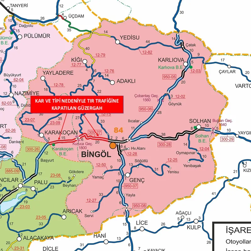 Yetkililerden alınan bilgiye göre, Bingöl-Erzurum Devlet Yolunun 0-88 kilometreleri arası (Kervansaray Kavşağı ile Bingöl-Erzurum il sınırı arası), yoğun kar yağışı ve tipi nedeniyle saat 16.50 itibarıyla tır trafiğine kapatıldı. Ayrıca, Bingöl-Elazığ Yolu’nun 0-46 kilometreleri arası da olumsuz hava koşulları sebebiyle geçici olarak ağır taşıt trafiğine kapatıldı.