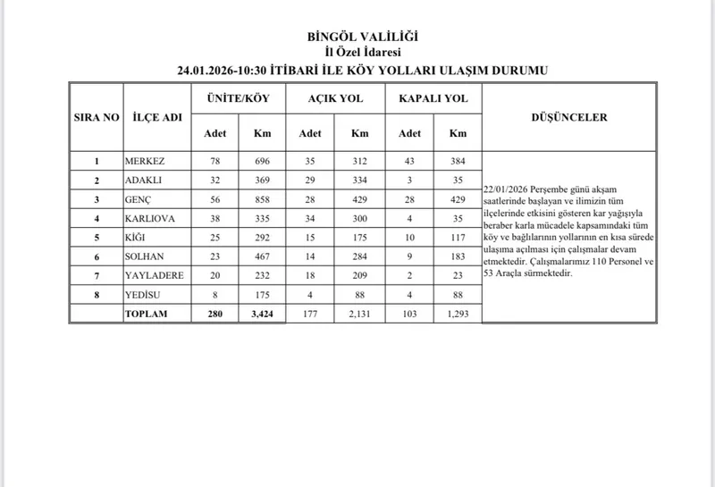 Kar yağışının özellikle yüksek kesimlerde etkisini artırması nedeniyle 103 köy yolunda ise kar küreme ve yol açma çalışmaları devam ediyor. Ekiplerin, hava şartlarının elverdiği ölçüde kapalı yolları yeniden ulaşıma açmak için gece gündüz demeden çalıştığı bildirildi.