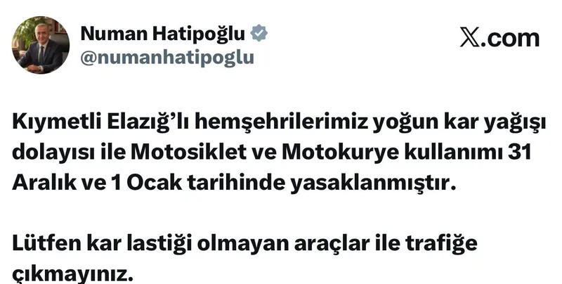 Elazığ Valisi Numan Hatipoğlu, kentte etkili olan yoğun kar yağışı nedeniyle 31 Aralık ve 1 Ocak tarihlerinde motosiklet ve motokurye kullanımının yasaklandığını duyurdu. Vali Hatipoğlu ayrıca, kar lastiği bulunmayan araçlarla trafiğe çıkılmaması konusunda vatandaşları uyardı.
