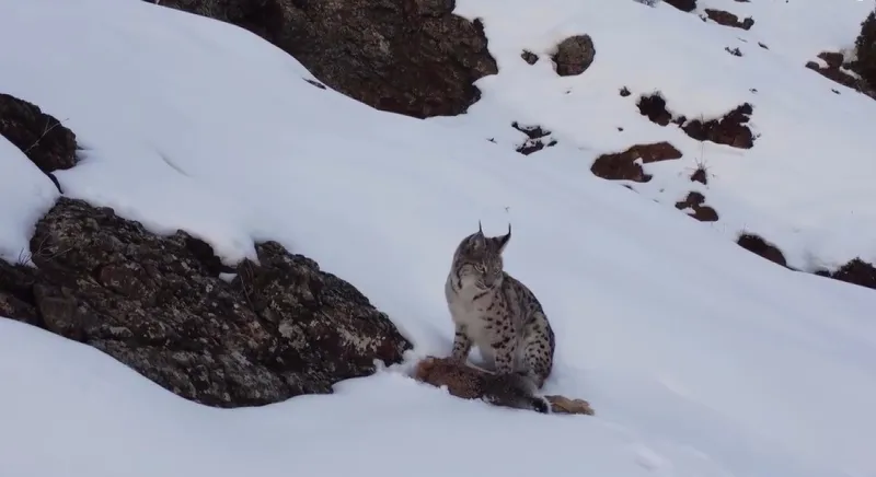 Erzincan’ın Refahiye ilçesinde, nesli tükenme tehlikesi altında bulunan vaşak, avladığı tavşanla birlikte görüntülendi. Sosyal medyada "Doğadaki Kız" olarak tanınan Berfin Karataş’ın kaydettiği görüntüler kısa sürede büyük ilgi gördü.