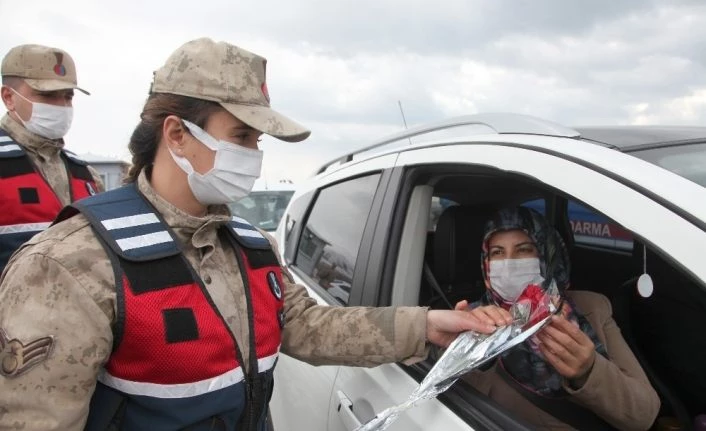 Ahlat - Adilcevaz karayolu üzerinde bulunan Çimenli trafik uygulama noktasında görev alan İlçe Jandarma Komutanlığı ekipleri, durdurdukları araçlarda bulunan kadınlara gül hediye ederek 8 Mart Dünya Kadınlar Günü’nü kutladı.