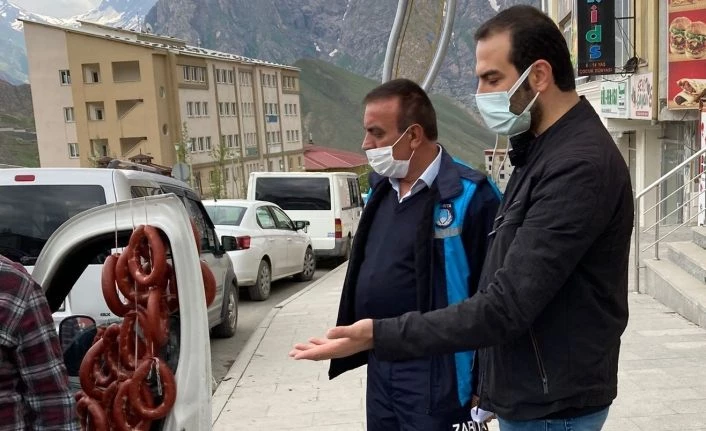 Zabıta ekibi gıda ve hijyen kurallarından uzak bir şekilde il dışında gelip Hakkari’de sucuk satışı yapan bir işportacının sucukları toplattırarak aracı ile birlikte şehir dışına sevki gerçekleştirildi. Zabıta Müdürü Adil, sokakta satılan ve menşei belli olmayan gıda mamullerine izin vermeyeceklerini belirtti. Demir, "Açıkta ve hijyenik olmayan koşullarda gıda satışına kesinlikle izin verilmeyeceğiz. Açıkta satışa sunulan gıda ürünleri halk sağlığını tehlikeye atmanın yanı sıra nerede ve nasıl üretildiği belli olmuyor. Hijyen şartını yerine getirmeyen, kayıt dışı satış yapan şahıslara itibar edilmemesi gerekiyor. Bizim için halkımızın sağlığı her şeyden önemli. Vatandaşlarımızın gerekli üretim ve satış izni alınmış, etiketi bulunan ürünleri tüketmesini istiyoruz. Ayrıca kentin değişik noktalarında korona virüs denetimlerimizi de aralıksız olarak sürdürüyoruz" dedi.