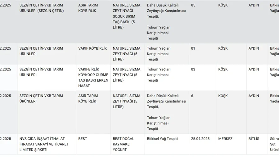 Bakanlığın ifşa listesi sadece et ürünleriyle sınırlı değil. Zeytinyağı olarak satılan ürünlerde ayçiçek, pamuk gibi tohum yağlarının karıştırıldığı, yoğurtlarda ise kıvam artırıcı olarak nişasta kullanıldığı tespit edildi. Bu durum, gıda hilesinin ne denli yaygın olduğunu gözler önüne seriyor.