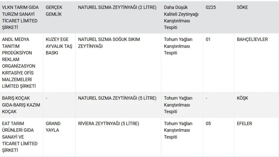 ZEYTİN YAĞINDA TOHUM YAĞI TESPİT EDİLEN MARKALAR