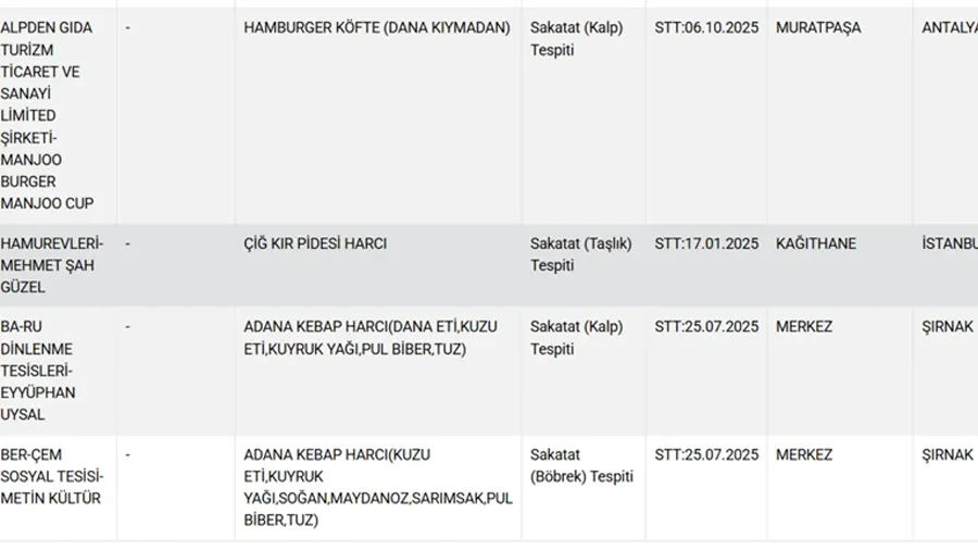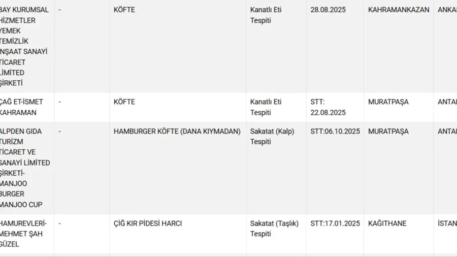 Tarım ve Orman Bakanlığı, gıda denetimlerinde tespit edilen taklit ve tağşiş yapılmış ürünleri ifşa etti. Köftede deri, hamburgerde kalp, kebapta böbrek tespit edilen firmaların tam listesi. Hileli gıdalara karşı tüketicileri uyaran resmi listeyi inceleyin.