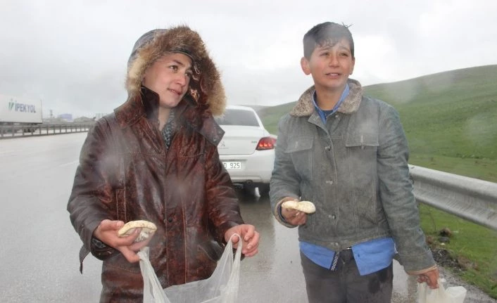 Erzurum’da otoyol üzerinde mantar satan çocuklar ekmek parası kazanabilmek için yağmur altında mücadele ediyor.
