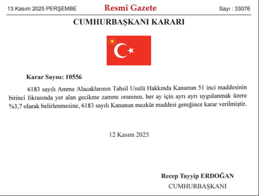Cumhurbaşkanı Recep Tayyip Erdoğan'ın imzasıyla yayımlanan karar, milyonlarca mükellefi ve vatandaşı ilgilendiren önemli bir düzenlemeyi hayata geçirdi. Kamu alacaklarına uygulanan gecikme zammı oranı, aylık bazda yüzde 4,5'ten yüzde 3,7'ye indirildi. Düzenleme, vergi, ceza ve prim borçlarına ilişkin ödemelerini geciktirenler için yükü hafifletici bir adım olarak öne çıkıyor.