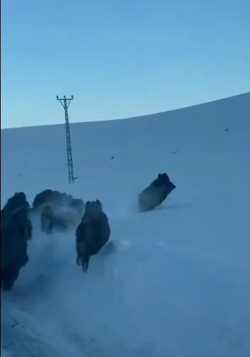 Merkeze bağlı Akyaka köyü yolunda sabah saatlerinde otomobiliyle seyreden Vedat Özgür’ün önüne aniden bir domuz sürüsü çıktı. Yol boyunca ilerleyen domuzlar bir süre aracın önünde koşarak ilerledi. Sürücü Özgür ise hayvanlara zarar vermemek için aracın hızını düşürerek ilerledi. Bir süre sonra yol kenarındaki karla kaplı alana yönelen domuzlar gözden kayboldu. Yaşanan ilginç anlar sürücünün cep telefonu kamerasıyla kayıt altına alındı.