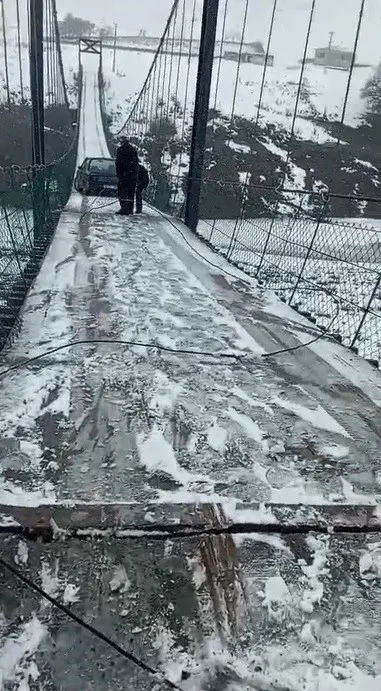 Kars’ta asma köprüde korku dolu anlar: Otomobil buzda kayarak asılı kaldı