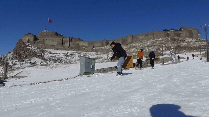 Doğu Anadolu’nun karla kaplı masalsı şehri Kars’ta, dondurucu soğuklara aldırış etmeyen vatandaşlar soluğu Kars Kalesi’nin yokuşunda aldı. Kar yağışını eğlenceye dönüştüren çocuklar, ellerinde kızaklarla kale yolunda renkli görüntüler oluşturdu.
