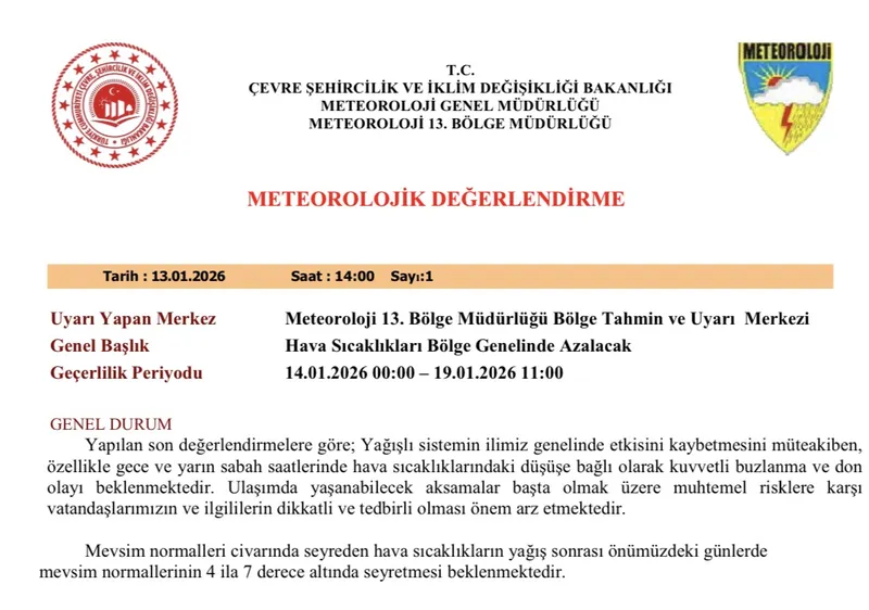Meteoroloji 13. Bölge Müdürlüğü’nden yapılan uyarıda, "Yapılan son değerlendirmelere göre; yağışlı sistemin ilimiz genelinde etkisini kaybetmesini müteakiben, özellikle gece ve yarın sabah saatlerinde hava sıcaklıklarındaki düşüşe bağlı olarak kuvvetli buzlanma ve don olayı beklenmektedir. Ulaşımda yaşanabilecek aksamalar başta olmak üzere muhtemel risklere karşı vatandaşlarımızın ve ilgililerin dikkatli ve tedbirli olması önem arz etmektedir. Mevsim normalleri civarında seyreden hava sıcaklıkların yağış sonrası önümüzdeki günlerde mevsim normallerinin 4 ila 7 derece altında seyretmesi beklenmektedir" denildi.