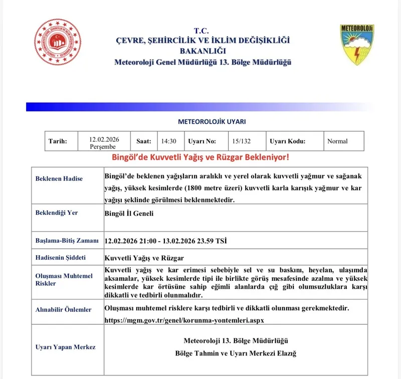 Meteoroloji 13. Bölge Müdürlüğü’nden yapılan açıklamada, "Bingöl’de beklenen yağışların aralıklı ve yerel olarak kuvvetli yağmur ve sağanak yağış, yüksek kesimlerde (1800 metre üzeri) kuvvetli karla karışık yağmur ve kar yağışı şeklinde görülmesi beklenmektedir. Kuvvetli yağış ve kar erimesi sebebiyle sel ve su baskını, heyelan, ulaşımda aksamalar, yüksek kesimlerde tipi ile birlikte görüş mesafesinde azalma ve yüksek kesimlerde kar örtüsüne sahip eğimli alanlarda çığ gibi olumsuzluklara karşı dikkatli ve tedbirli olunmalıdır" denildi.