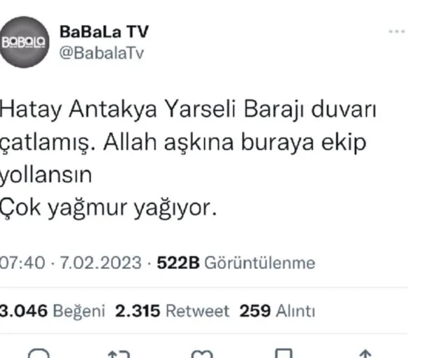 Kahramanmaraş ili Pazarcık ilçesi ve Elbistan ilçesi merkez üsleri olan 2 deprem sonrası sosyal medya platformunda "BaBala TV" isimli twitter hesabından Kahramanmaraş Kumçatı köyünde barajın çatladığı, Hatay Yarseli Barajının duvarının çatladığı yönünde paylaşımlarda bulunulduğu, bu paylaşımların deprem bölgesinde depremzede vatandaşlar arasında korku ve paniğe neden olduğu, arama kurtarma çalışmalarında aksamalara neden olduğu dikkate alınarak "BaBala TV" isimli twitter hesabında yapılan paylaşımlar nedeniyle hesap sahibi olduğu tespit edilen Oğuzhan UĞUR hakkında "Halkı yanıltıcı bilgiyi alenen yayma" suçundan İstanbul Cumhuriyet Başsavcılığı tarafından re'sen soruşturma başlatıldı. Kaynak: Sabah