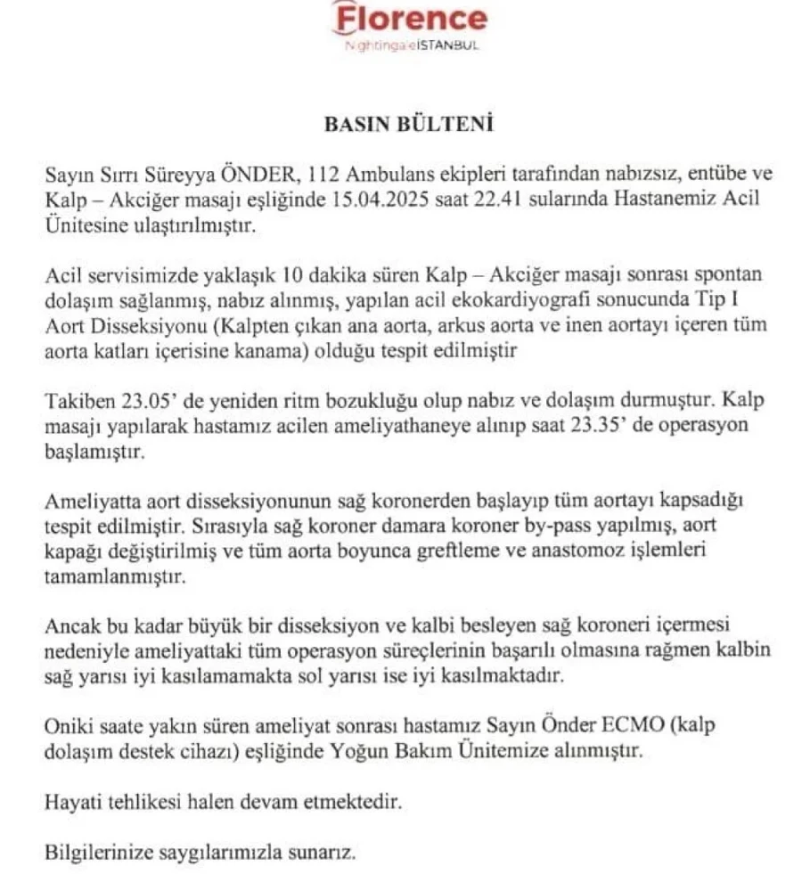 Hastane tarafından yapılan ilk açıklamada, Önder'in 112 ambulans ekipleri tarafından nabızsız, entübe ve kalp-akciğer masajı eşliğinde hastaneye ulaştırıldığı bilgisi paylaşıldı. Acil serviste yapılan yaklaşık 10 dakikalık kalp-akciğer masajının ardından dolaşımın yeniden sağlanması üzerine, Önder acilen ameliyathaneye alındı.