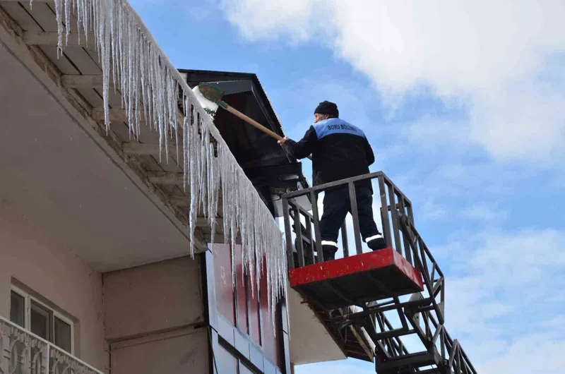 Soğuk hava şartları nedeniyle meydana gelen ve özellikle yayalar için tehlike oluşturan buz sarkıtları, ekiplerin kontrollü müdahalesiyle kırılarak kaldırıldı.