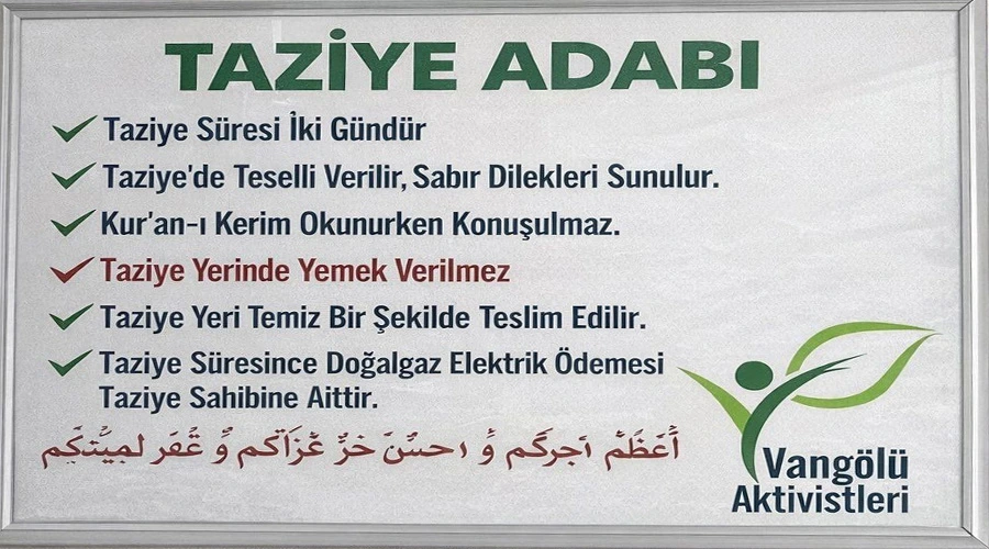 Van Gölü Aktivistleri Derneği, taziye adabına ilişkin daha önce gündeme getirdikleri çağrıya yanıt niteliğinde bir adım atıldığını duyurdu. Van'da bazı taziye evlerinde başlatılan uygulama ile taziye süresinin iki günle sınırlandırılması ve taziye yerinde yemek verilmemesi kararı, dernek tarafından "somut ve olumlu bir adım" olarak değerlendirildi.