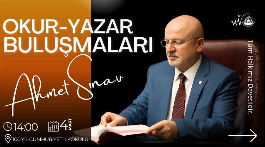 Van Büyükşehir Belediyesi'nin düzenlediği Okur-Yazar Buluşmaları kapsamında Yazar Ahmet Sınav, 4 Mart Çarşamba günü 100. Yıl Cumhuriyet İlkokulu'nda kitapseverlerle bir araya geliyor.