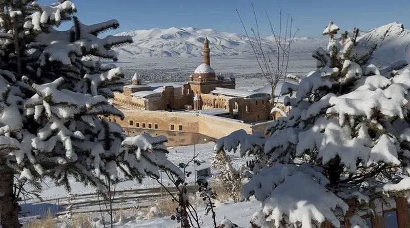 Kar yağışının ardından sarayın avlusu, taş duvarları ve çevresindeki tarihi dokular tamamen karla kaplanırken, oluşan manzara görenleri hayran bıraktı. Doğubayazıt’ın simgelerinden biri olan İshak Paşa Sarayı, karın etkisiyle kartpostallık görüntüler sunarak ziyaretçilerin ve fotoğraf tutkunlarının ilgisini çekti.