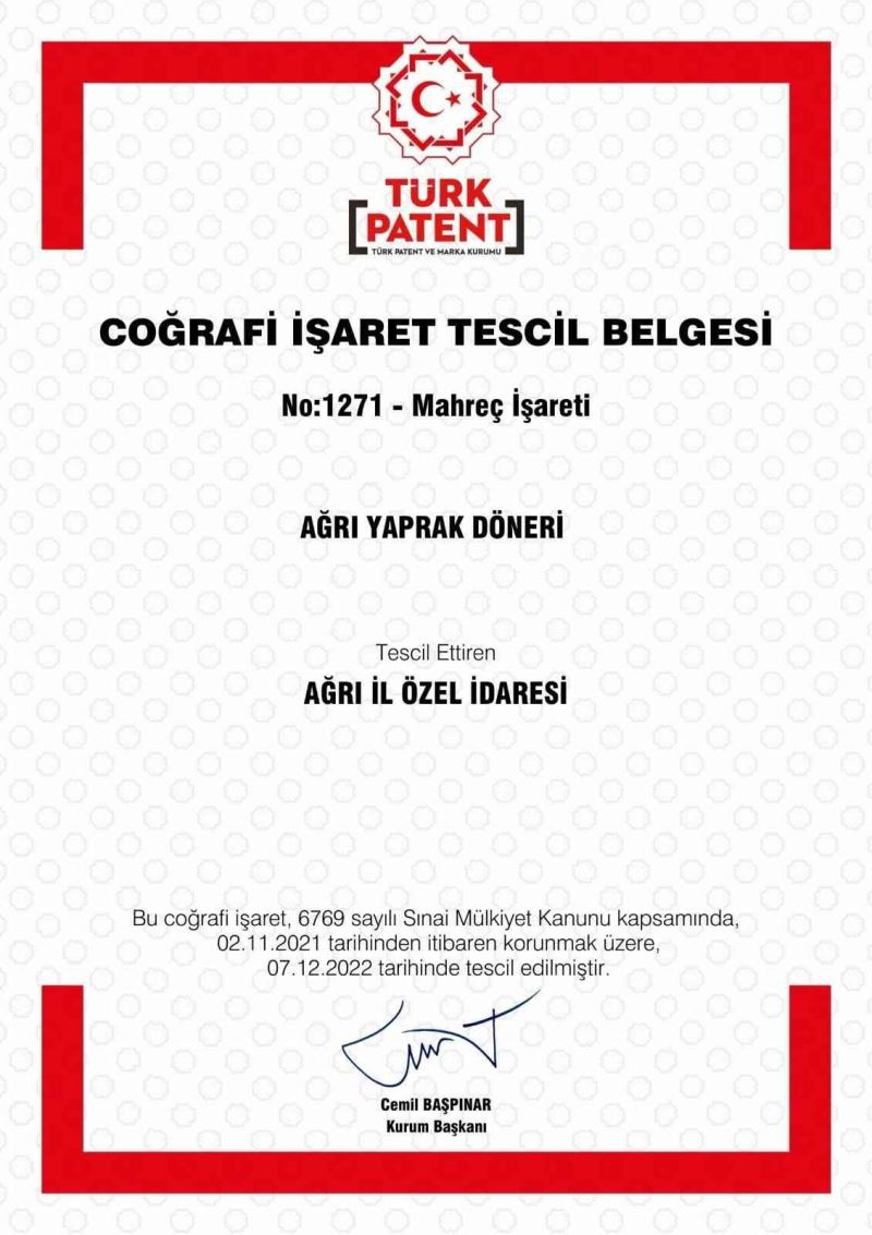 Ağrı İl Özel İdaresi tarafından tescil başvurusu yapılan Ağrı Yaprak Döneri ve Haşıl Yemeği, Türk Patent ve Marka Kurumunca coğrafi işaret olarak tescil edildi.