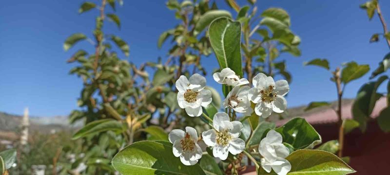 Elazığ’da armut ağacı, üzerinde meyvesi olmasına rağmen sonbahar mevsiminde tekrar çiçek açtı.