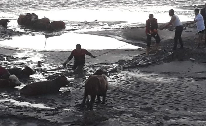 Ağrı’nın merkeze bağlı 100. Yıl Mahallesinde Murat Nehri civarında inek sürüsünü suyun karşısına geçirmek isteyen Müslüm Bulut, kontrolü sağlayamayınca 17 ineği bataklığa saplandı. Hayvanları saplandığı yerden kurtaramayan Bulut, durumu itfaiye ekiplerine bildirdi. Kısa sürede olay yerine gelen itfaiye ekipleri vatandaşların da yardımıyla bataklığa girerek halat desteğiyle inekleri saplandığı yerden kurtardı. Kurtarılan inekler sahibine teslim edildi.