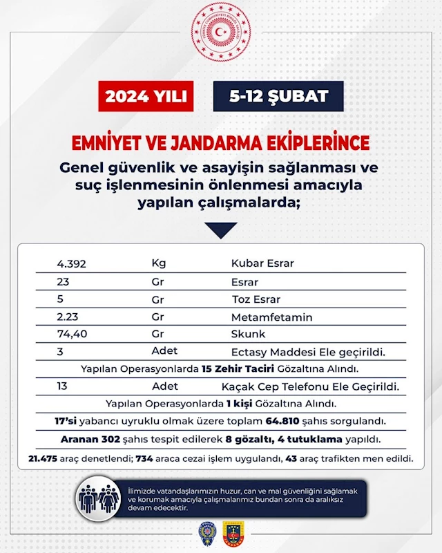 Bingöl Valisi Ahmet Hamdi Usta, İl Emniyet Müdürlüğü ve İl Jandarma Komutanlığı ekiplerinin 5-12 Şubat tarihleri arasında gerçekleştirdiği faaliyetleri paylaştı. Uyuşturucu operasyonlarında 15 kişinin gözaltına alındığını belirten Vali Usta, “4 kilo 392 gram kubar esrar, 23 gram esrar, 5 gram toz esrar, 2 gram metamfetamin, 74 gram skunk, 3 adet ectasy maddesi ele geçirildi. Yapılan operasyonlarda 15 zehir taciri gözaltına alındı. 13 adet kaçak cep telefonu ele geçirildi, 1 kişi gözaltına alındı. 17’si yabancı uyruklu olmak üzere 64 bin 810 şahıs sorgulandı, aranan 302 şahıs tespit edilerek 8 gözaltı, 4 tutuklama yapıldı. 21 bin 475 araç denetlendi, 734 araca cezai işlem uygulandı, 43 araç trafikten men edildi” dedi.