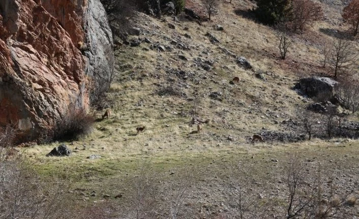 Tunceli’de yüksek rakımlı bölgelerden aşağıları kadar inen yaban keçileri, kısıtlamalarda sessizliğe bürünen bölgelere kadar inerek karınlarını doyururken görüntülendi.