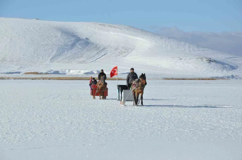 Aslan, "Çıldır gölü buz tuttu. 15-20 santim aralığında buz kalınlığımız var. Atlarımızı çıkardık, atlı kızaklarla gezinti yapıyoruz. Kar motorlarımız, atlı kızaklarımız hepsi gölün üzerinde gelen misafirlerimizi Mart ayına kadar ağırlamaya çalışacağız" diye konuştu.