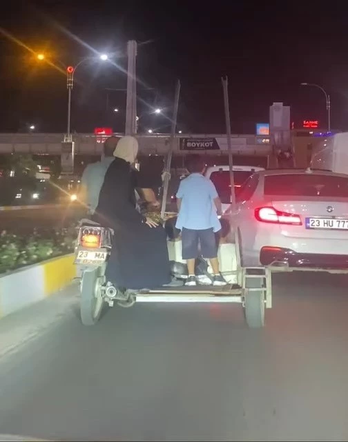 Olay, merkez Malatya Caddesi’nde meydana geldi. Edinilen bilgiye göre, 3’ü çocuk 5 kişi sepetli motosiklete bindi. Çocuklardan 2’si sepette otururken biri ise ayakta gitti. Tehlikeli yolculuk diğer sürücüler tarafından cep telefonu kamerası ile kaydedildi.
