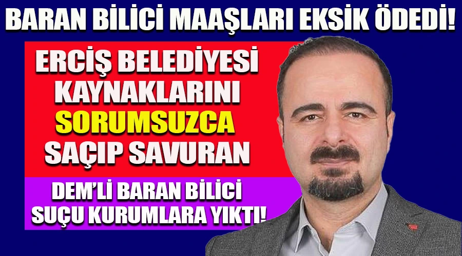 Erciş Belediye Başkanı DEM’li Baran Bilici sorumsuz davranması ve belediye kaynaklarını çarçur etmesi nedeniyle çalışan maaşlarını eksik ödedi.