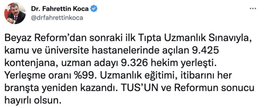 TUS'da yerleşme oranının yüzde 99 olduğuna dikkati çeken Koca, "Beyaz Reform'dan sonraki ilk TUS ile kamu ve üniversite hastanelerinde açılan 9 bin 425 kontenjana, uzman adayı 9 bin 326 hekim yerleşti. Uzmanlık eğitimi, itibarını her branşta yeniden kazandı." ifadesini kullandı.