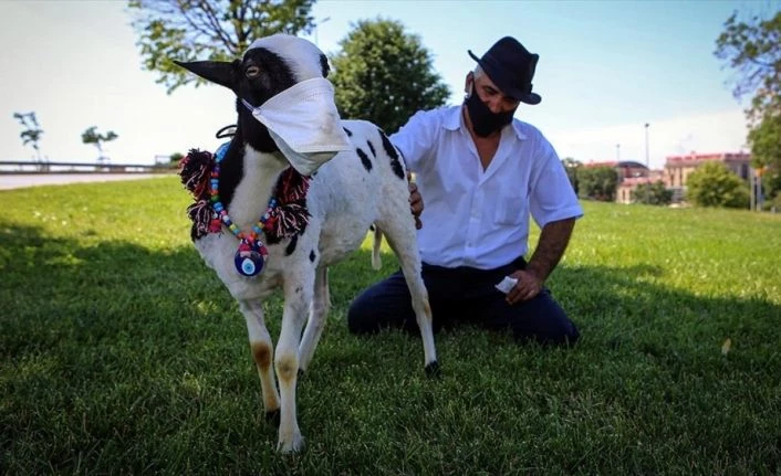 İSTANBUL(AA) - Küçükçekmece'nin Sefaköy semtinde mısır satan Mehmet Beşir Sain, evinde beslediği ve yanından hiç ayırmadığı kuzusu "Boncuk"a yeni tip koronavirüs (Kovid-19) salgını tedbirleri doğrultusunda maske takarak, hem onu hastalıklardan korumaya çalışıyor hem de farkındalık yaratıyor.