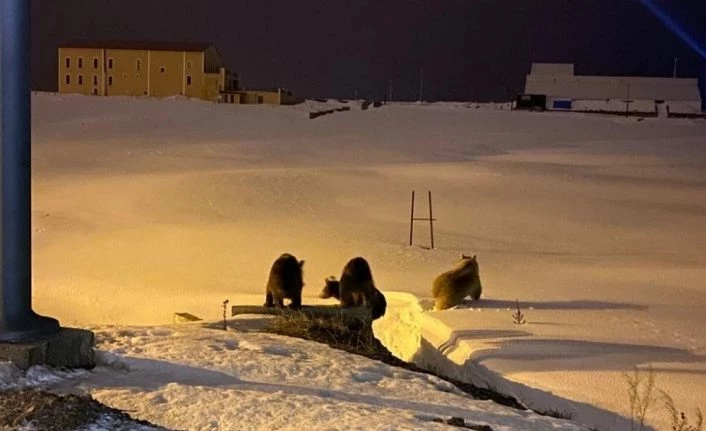 Sarıkamış’ta kış uykusundan uyanan anne ve yavru boz ayılar cadde ve sokaklarda yiyecek aradı. Anne ve 3 yavru ayı kameralara yansıdı.