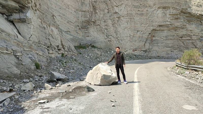 Sarı, yola düşen devasa büyüklükteki kayadan kıl payı kurtuldu. Kayadan sıçrayan taş parçaları aracın jantına, tamponuna ve farına isabet etti. Sarı, son anda yaptığı manevra ile kazayı maddi hasar ile atlattı.