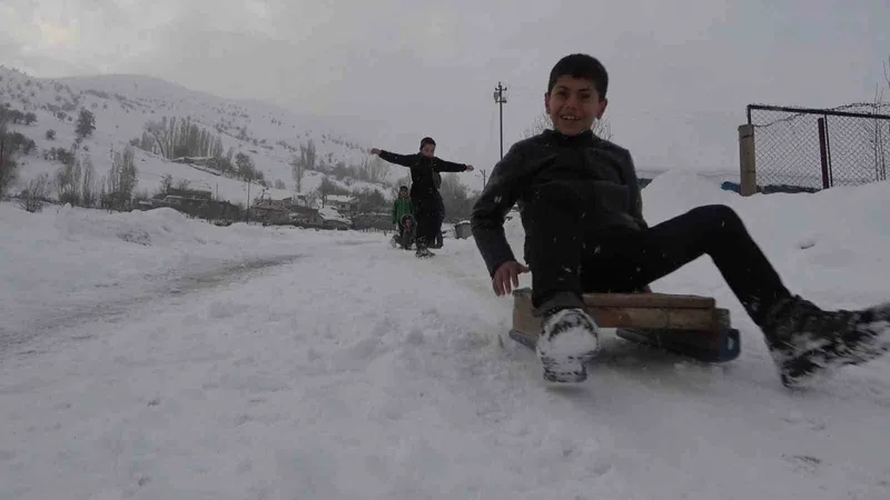 Muş’ta kırsal kesimde etkili olan kar yağışı, çocuklar için eğlenceye dönüştü. Hasköy ilçesine bağlı Dağdibi köyünde yaşayan çocuklar, kendi imkânlarıyla yaptıkları el yapımı demir patenlerle köyün yokuşlu yollarını adeta kayak pistine çevirdi. Renkli görüntülerin oluştuğu anlarda çocukların mutluluğu yüzlerine yansıdı. Zaman zaman yolların kar temizleme ekipleri tarafından açılması nedeniyle üzüldüklerini dile getiren çocuklar, buna rağmen fırsat buldukça farklı alanlarda kayarak karın tadını çıkarmaya devam ediyor.
