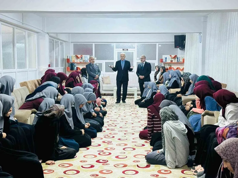 "1001 Hatim Dua Programı" için Erzurum’da bulunan DİB Başkan Yardımcısı Dr. Hazırlar, İl Müftüsü Yaşar Çapçı ve Palandöken İlçe Müftüsü Ahmet Gözcü ile beraber; Palandöken İlçe Müftülüğü’ne bağlı Yenişehir Yatılı Kız Kur’an Kursu’nda hafızlık eğitimi alan öğrencilerle buluştu. Burada hafızlarla hasbihal eden Başkan Yardımcısı Dr. Hazırlar, öğrencilere yönelik hafızlığın önemine dair bir konuşma yaptı. Başkan Yardımcısı Hazırlar, Kur’an kursu öğreticileriyle yaptığı toplantının ardından ziyaretini tamamladı.