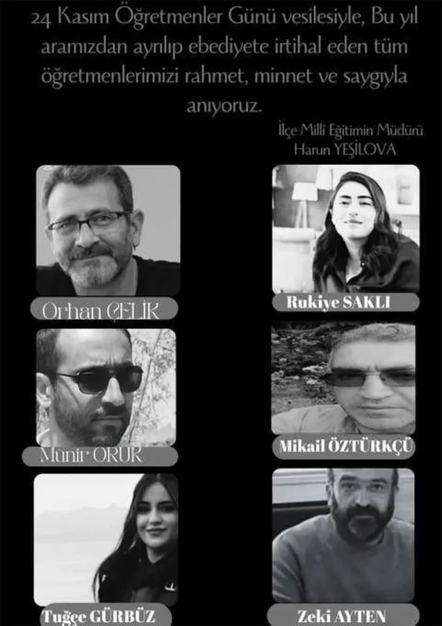 Müdürlük tarafından paylaşılan anma görselinde, 2023 yılı içinde ebediyete uğurlanan öğretmenlerin fotoğrafları ve isimleri yer aldı. Bu karede; Orhan Çelik, Rukiye Saklı, Munir Orur, Mikail Öztürkçü, Tuğçe Gürbüz ve Zeki Ayten'in hatıralarına yer verilerek, eğitim camiasının unutulmaz isimleri bir kez daha yâd edildi. Her birinin emek ve fedakarlıklarına dikkat çekilen mesajda, gelecek nesilleri yetiştirmedeki rollerinin asla silinmeyeceği belirtildi.