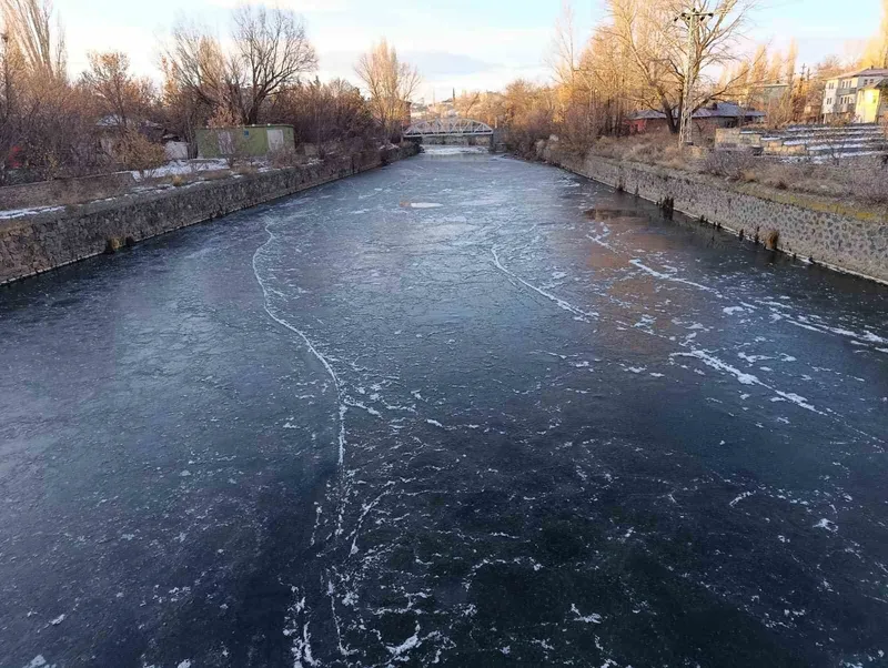 Kars Çayı’nın yüzeyi, dondurucu soğuklar nedeniyle sadece bir gün içerisinde tamamen buzla kaplandı. Çayın donmuş görüntüsü, bölgenin ne denli çetin bir kış yaşadığını gözler önüne seriyor.