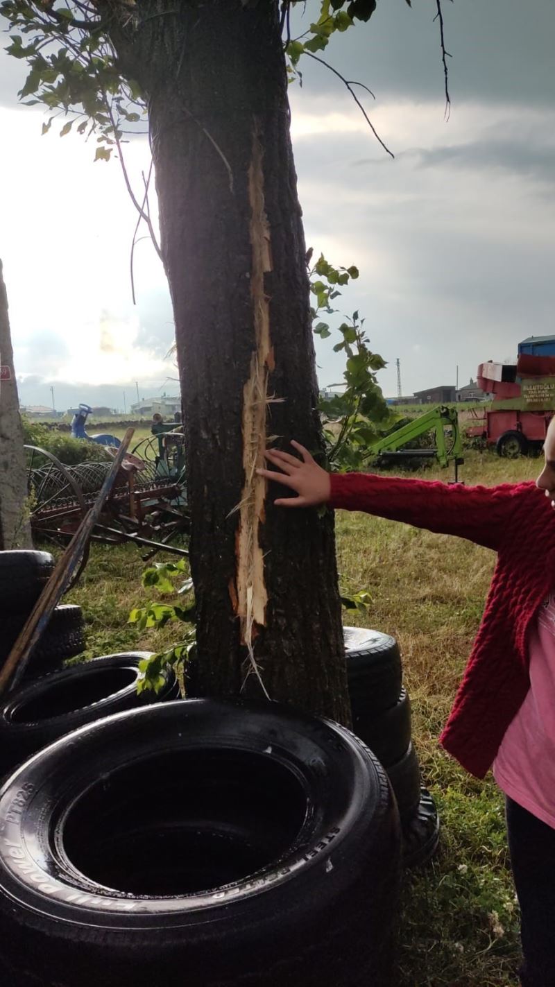 Kars’ta bir evin bahçesinde bulunan ağaca yıldırım düştü. Yıldırımın isabet ettiği ağaç ikiye bölündü.