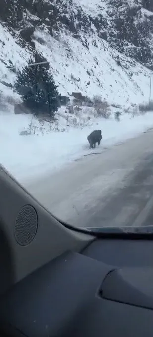 Kars-Ardahan-Göle-Balçeşme kara yolu üzerinde seyir halindeki sürücü, yol kenarında beklenmedik misafirlerle karşılaştı. Ağır kış şartlarının hüküm sürdüğü bölgede, aç kalan yaban domuzu yiyecek aramak için yerleşim yerlerine yakın noktalara kadar geldi. Tek başına yürüyen domuz, daha sonra geri dönerek dağlık alana yöneldi. O anlar araç sürücüsü Vedat Demiral’ın cep telefonuyla kaydedildi. Görüntüde, yol kenarında ilerleyen, daha sonra geri dönerek dağa çıkan domuzun rahat hareketleri yer alıyor.