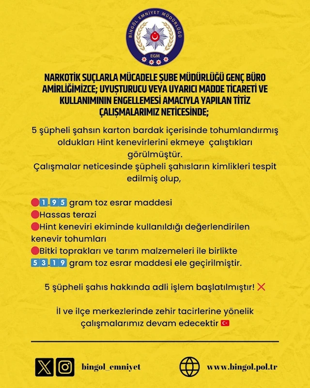 Bingöl Emniyet Müdürlüğü Narkotik Suçlarla Mücadele Şube Müdürlüğü Genç Büro Amirliğince uyuşturucu veya uyarıcı madde ticareti ve kullanımını engellemek amacıyla çalışma gerçekleştirdi. Çalışmalar neticesinde 5 şüpheli şahsın karton bardak içerisinde tohumlandırılmış oldukları Hint kenevirlerini ekmeye çalıştıkları belirlendi. Çalışmalar neticesinde şahısların kimlikleri tespit edildi. Operasyonda 1.95 gram toz esrar, hassas terazi, Hint keneviri ekiminde kullandıkları değerlendirilen kenevir tohumları, bitki toprakları ve tarım malzemeleri ile 53.19 gram toz esrar maddesi ele geçirildi. Yakalanan 5 şüpheli hakkında adli işlemlere başlandığı belirtildi.