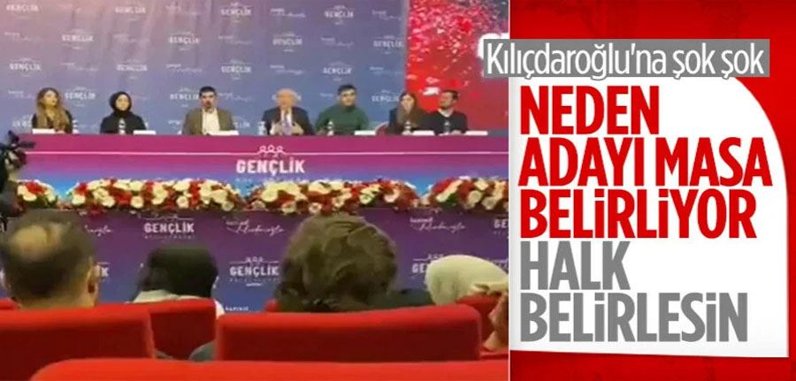 Kılıçdaroğlu yaptığı konuşmada, aday belirsizliği devam ederken altılı masaya da değinerek, "Cumhurbaşkanı adayını 6 lider belirleyecek. Dolayısıyla ben onların adına konuşamam. Böyle bir dayatma kültürü de yok zaten bizde." ifadelerini kullandığı sırada salondaki bir genç araya girdi.