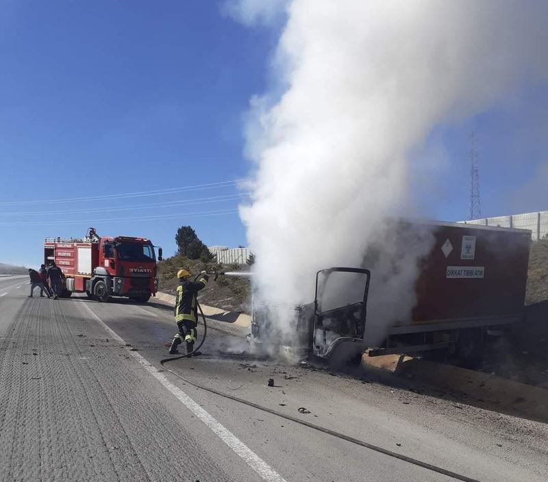 Kütahya’da seyir halindeyken yangın çıkan tıbbi atık aracı kullanılamaz hale geldi.
