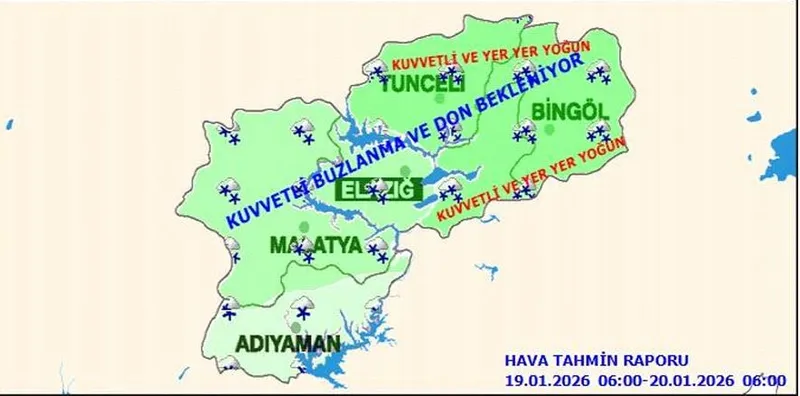 Meteoroloji 13. Bölge Müdürlüğü’nden yapılan uyarıda, "Tunceli ve Bingöl çevreleri ile Elazığ’ın doğu kesimlerinde beklenen kar yağışlarının kuvvetli (10-20 cm), yüksek kesimlerde (1500m ve üzeri) ise yoğun (20 cm ve üzeri) kar yağışları beklendiğinden ulaşımda aksamalar, kuvvetli buzlanma ve don olayı ile yüksek kesimlerde tipi gibi olumsuzluklara karşı vatandaşlarımızın ve ilgili birimlerin dikkatli ve tedbirli olması önem arz etmektedir. Bölge genelinde kuvvetli buzlanma ve don olayı beklendiğinden yaşanabilecek olumsuzluklara karşı dikkatli ve tedbirli olunması önem arz etmektedir. Elazığ, Malatya, Tunceli, Bingöl çevreleri ile Adıyaman’ın kuzey kesimlerinde yüksek kar örtüsüne sahip eğimli alanlarda çığ tehlikesi bulunduğundan yaşanabilecek olumsuzluklara karşı dikkatli ve tedbirli olunması önem arz etmektedir" denildi.