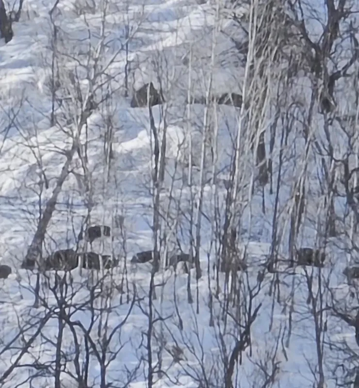 Tunceli’nin doğal güzellikleriyle öne çıkan Munzur Vadisi’nde, karlı dağlarda yiyecek arayan domuz sürüsü görüntülendi.