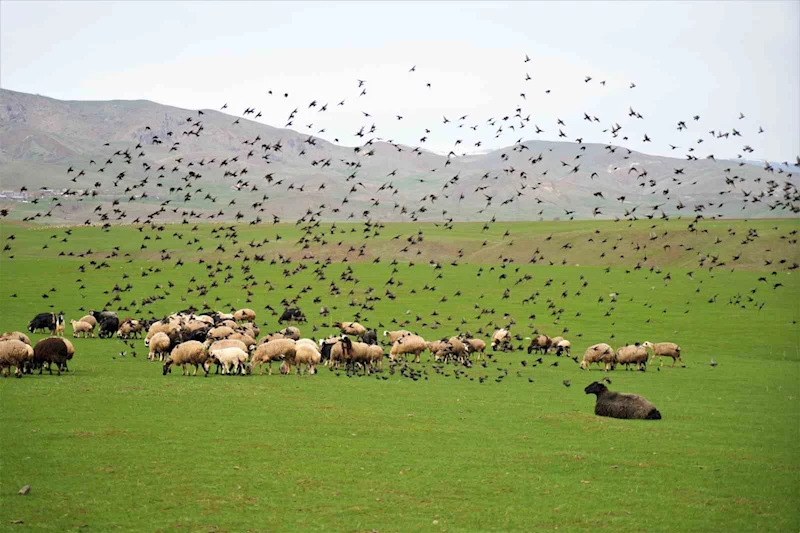 Muş’a bağlı Karabey Köyünde bahar mevsiminin gelmesi ile doğa canlanırken, göçmen kuşlar da ovaya akın etti. Muş Ovası’na gelen sığırcık sürüsünün otlayan koyunların üzerindeki dansı, güzel görüntüler oluşturdu. Koyun sürüsüne günlerdir merada eşlik eden kuşlar, sürü ile gününü geçiriyor.