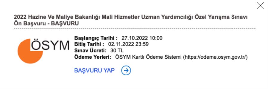 Ölçme, Seçme ve Yerleştirme Merkezi Başkanlığından Hazine ve Maliye Bakanlığı 400 memur alımı hakkında duyuru geldi. Başvuru kılavuzu yayımlanarak başvuru süreci başlamıştır. Adaylar MHUY başcvurularını 27 Ekim 2022 tarihi ile 2 Kasım 2022 tarihleri arasında gerçekleştireceklerdir. Bu kapsamda adayların MHUY Ön Başvurusu için belirtilen ücreti ödemeleri gereklidir.