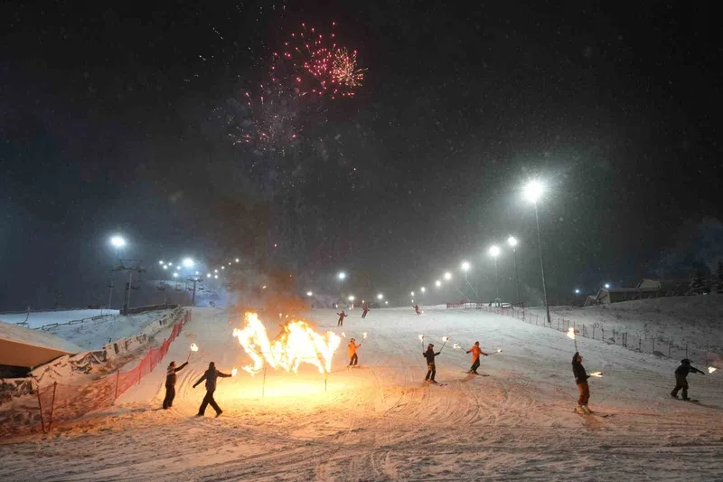 Kış turizminin gözde mekanlarından Erzurum Palandöken’de yılbaşı tatilini geçiren yerli ve yabancı misafirler, yeni yıla meşaleli kayak gösterisiyle girdi.